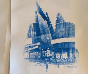Cyanotype of the Hollings Building, aka The Toast Rack. A modernist building built in the 1960’s. I merged this with a road scene I took on Oxford? Road.