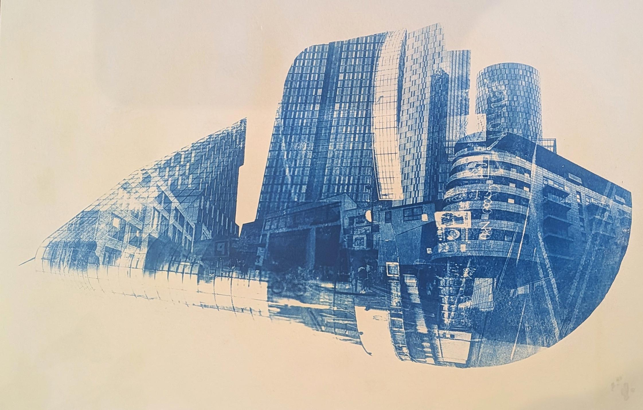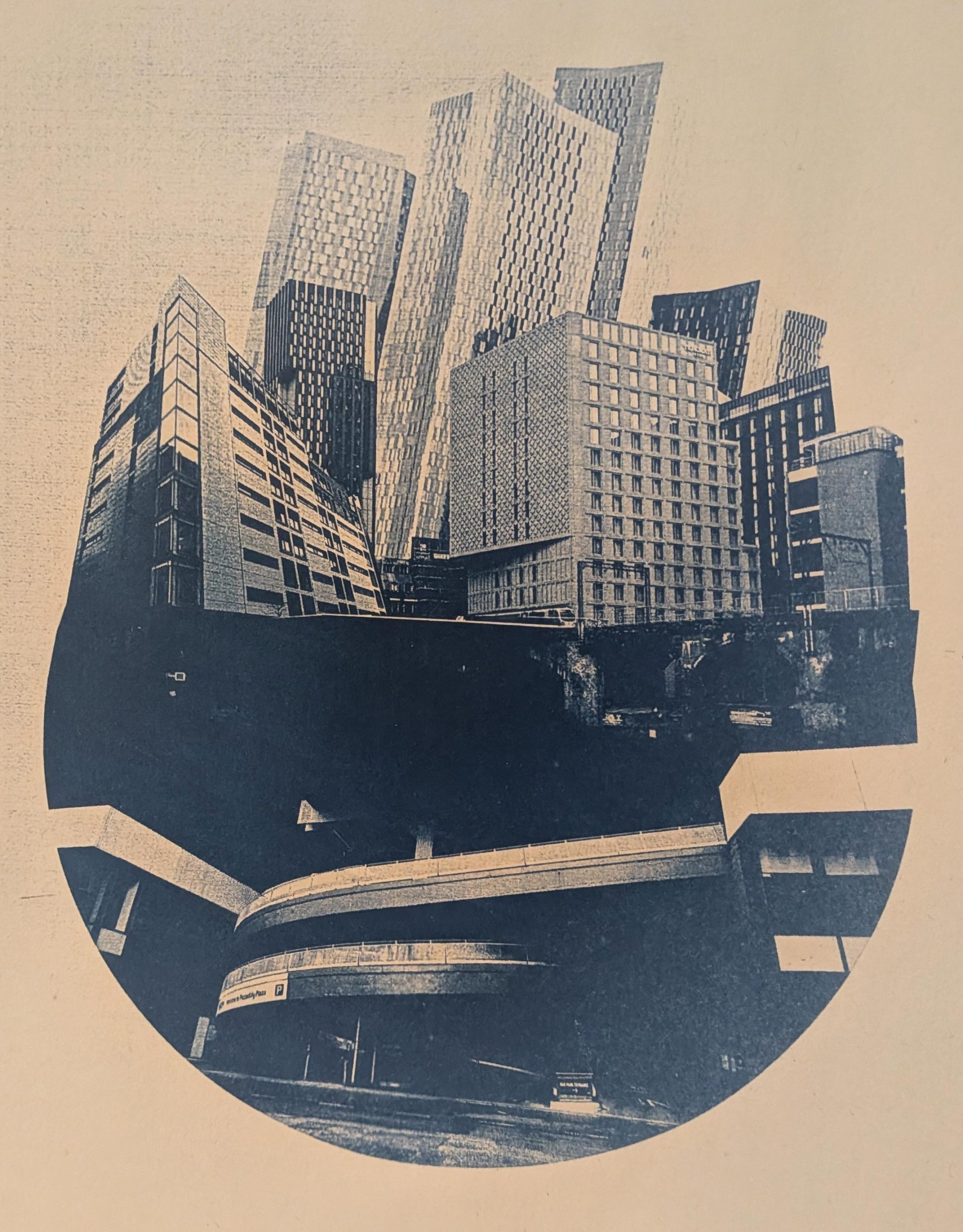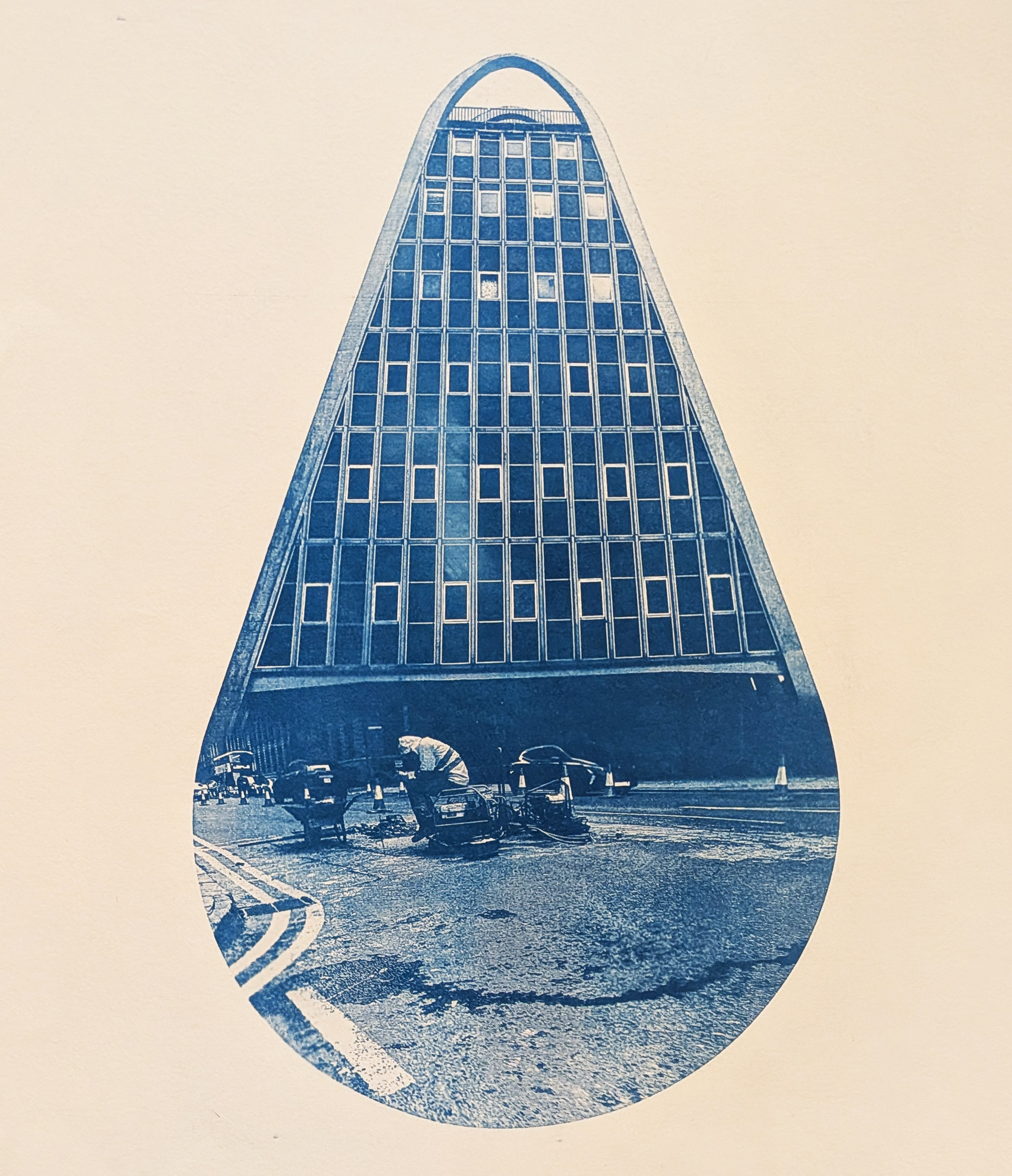 Cyanotype of the Hollings Building, aka The Toast Rack. A modernist building built in the 1960’s. I merged this with a road scene I took on Oxford? Road.